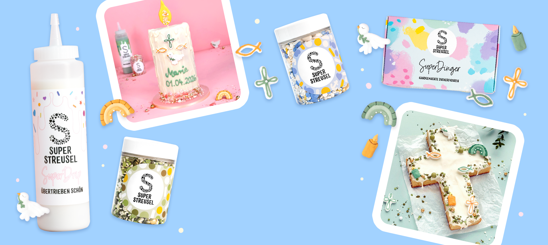 Unsere bunten StreuselMixe, KuchenGlasuren und GlitzerPuder zaubern alles blitzschnell wunderschön! -